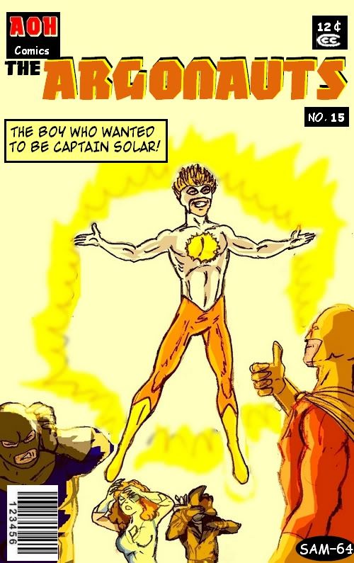 ABOVE - Argonauts issue 15 - introducing the short heroic career of Sunshine Boy, Almost Captain Solar's side kick, Less than two weeks after his first appearance He had left Earth for parts Unknown with the Alien creature called 'The Light'